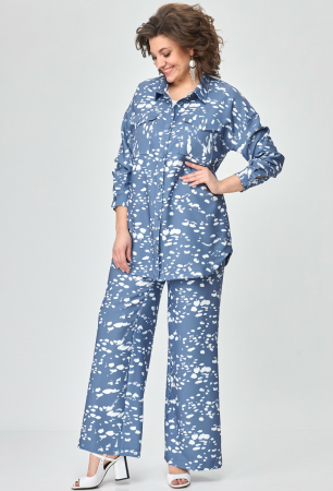 Костюм выполнен из ткани с набивным рисунком. Костюм состоит из рубашки и брюк. Рубашка прямого силуэта.
