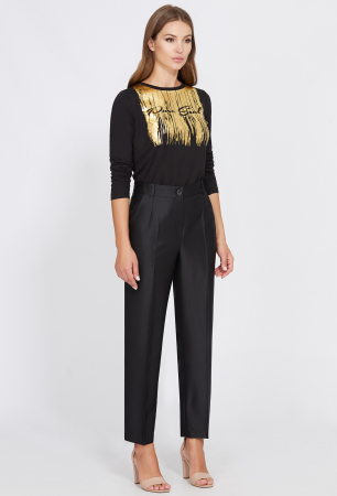 Брюки на притачном поясе со шлёвками с застёжкой на молнию и две петли-пуговицы, передние части с косыми карманами, задняя правая часть с карманом-обманкой с рамками.