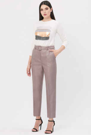 Брюки со стрелками на притачном поясе со шлёвками. Спереди косые карманы, застежка на молнию и декоративную пуговицу. Сзади два кармана-обманки с листочками. Талию подчёркивает съёмный пояс с пряжкой из основной ткани.