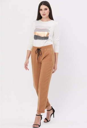Свободные брюки со стрелками на поясе, сосборенном на резинке, кулисой, манжетами, по передним частям два вертикальных прорезных кармана с листочками.