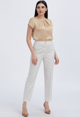 Стильные брюки со стрелками, на притачном поясе, с застежкой на молнию и петлю-пуговицу;