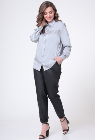 Брюки свободного силуэта, зауженные к низу, выполнены из искусственной кожи. По передней половинке выполнены карманы, в среднем шве обработана молния и застежка на петлю и пуговицу. По задней половине брюк обработаны талиевые, диагональные вытачки. Брюки с цельнокроеным поясом, шлевками и с эластичной тесьмой по задней половинке брюк. Низ брюк обработан притачной манжетой на резинке.
