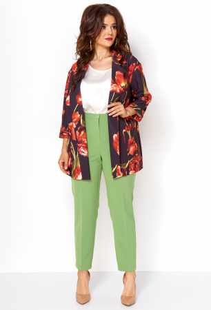 Костюм состоит из жакета и брюк. Жакет выполнен из ткани с набивным рисунком. Брюки выполнены из однотонной ткани. Жакет прямого силуэта, полочка с нагрудными вытачками, накладными карманами, входящими в боковой шов. Воротник пиджачного типа, стояче-отложной. Линия плеча спущена, рукав втачной, одношовный, длиной 3/4, по низу с манжетой. Спинка со средним швом. Брюки длиной 7/8, со стрелками, зауженные к низу.По передним половинам выполнены карманы, застежка в среднем шве на молнию. Брюки на притачной поясе с эластичной тесьмой и застежкой на петлю и пуговицу.