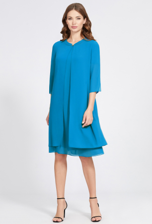 Почувствуйте себя непринуждённо шикарно в этом многослойном комплекте, состоящем из платья и съёмной развивающейся накидки в тон. Модель выполнили из мягкого струящегося, однотонного шифона и 100 % вискозной ткани. Платье А- образного силуэта с округлой формой горловины, короткими втачными, полупрозрачными рукавами и застёжкой на потайную тесьму-молнию в среднем шве спинки. Накидка соответствующего силуэта, с привлекательным фигурным вырезом горловины, втачными полупрозрачными рукавами с разрезами в верхнем шве и застёжкой на декоративный крючок со стразами.
