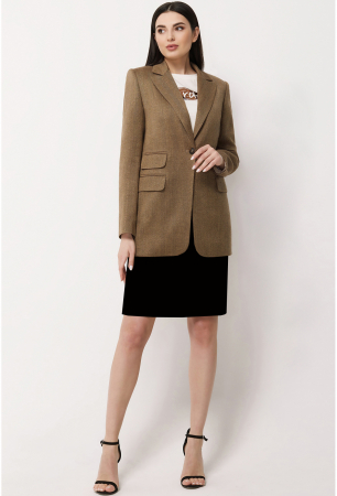 Однобортный жакет прямого силуэта с застежкой на петлю и пуговицу. Перед с двумя карманами с рамками и клапанами и одним карманом-обманкой с рамками и клапаном. Средний шов спинки заканчивается шлицей. Рукава втачные двушовные. Воротник отложной с лацканами. На подкладке.