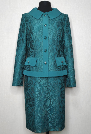 Комплект состоит из жакета и юбки. Жакет полуприлегающего силуэта дополнили отложным воротником и декоративными клапанами. Рукава втачные двухшовные. На подкладке.