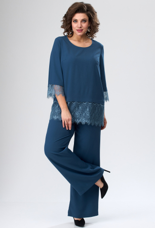 Костюм состоит из блузки и брюк. Костюм выполнен из однотонной ткани, в качестве отделки использовано кружевное полотно. Блузка прямого силуэта. Полочка блузки с нагрудными вытачками, горловиной круглой формы, в нижней части полочки обработана кокетка с наложением кружевного полотна. Спинка со средним швом. Рукав длиной ?, втачной, одношовный. По низу рукав обработан притачной манжетой из кружевного полотна. Брюки свободные, прямые, типа “поло”. На передней половинке выполнены наклонные карманы. Брюки на притачном поясе с эластичной тесьмой.