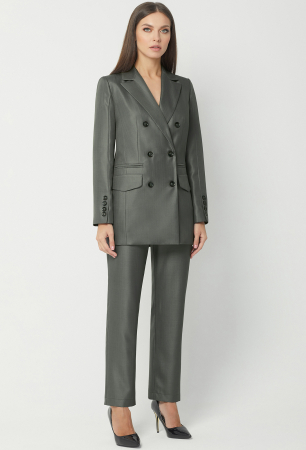 Двубортный удлинённый жакет с застёжкой на петли-пуговицы. Перед с двумя карманами-обманками с рамками и двумя прорезными карманами с клапанами и листочками. Рукава втачные двухшовные, передние швы со шлицами и отделочными пуговицами. Воротник отложной с широкими лацканами. На подкладке