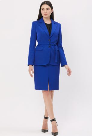 Классический жакет полуприлегающего силуэта будет уместен и в наряде для офиса, и в повседневном образе. Однобортной жакет с отложным воротником с лацканами . Перед с глубоким вырезом, с застежкой на две петли-пуговицы с двумя карманами с клапанами и рамками. Рукава втачные двухшовные. Снизить градус формальности помогает пояс из основной ткани с металлической пряжкой-карабин. На подкладке.