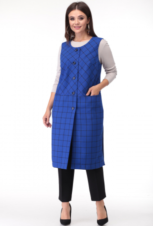 Жилет длиной до колена, прямого силуэта с центральной застежкой на пять петель и пуговиц. Горловина круглой формы, полочка отрезная ниже линии талии, в шве обработаны карманы. Верхняя часть полочки с нагрудными вытачками. По боковым швам, в нижней части выполнены разрезы. Спинка со средним швом.