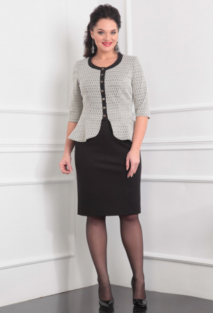 Комплект женский 2х предметный, состоит из жакета и юбки Жакет прилегающего силуэта из приятного плотного трикотажа с добавлением люрексовой нити.По линии талии жакета пришита баска по спинке по центру на баске сборка. По краю горлоины пришита планка. Застёжка на прорезные петли и пуговицы. Рукав 3/4. Юбка облегающего силуэта, к низу типа "карандаш", в рерху юбка на на обтачке, по задней половине юбки застёжка на потайную тесьму-молнию, по низу юбки открытая шлица. Юбка на трикотажной подкладке.