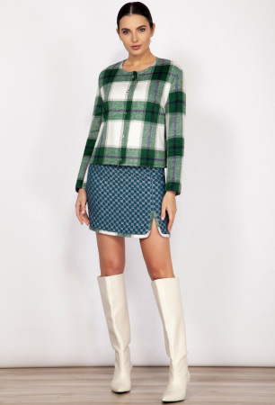Стильный и теплый костюм. Жакет прямого силуэта с нагрудной вытачкой из бокового шва и спущенной линией плеча. Рукав втачной двухшовный. Застежка центральная с закругленными краями борта на 5 кнопок. Перед с настрочными карманами. Вдоль горловины, борта, низа изделия и рукава, и вдоль верхнего края кармана притачана планка из отделочной ткани.