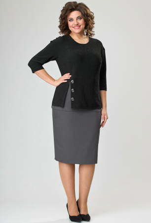 Костюм выполнен из 2-х видов ткани. Джемпер выполнен из трикотажного полотна. Юбка из костюмной ткани. Силуэт полуприталенный, со спущенной линией плеча.Полочка джемпера разрезная, нижняя часть двухслойная. На правой части в качестве отделки- пуговицы. Горловина круглой формы, рукав 3/4. Юбка, прилегающая по бедрам и зауженная к низу, длина чуть ниже колена, задняя часть юбки со шлицей. Пояс притачной с эластично тесьмой и застежкой на петлю и пуговицу.