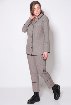 Костюм состоит из жакета и брюк. Жакет выполнен из трикотажного полотна. Жакет полуприлегающего силуэта. Перед с нагрудными вытачками, накладным карманом и центральной застежкой на петли и пуговицы. Горловина V – образной формы, с отложными лацканами и воротником пиджачного типа. Рукав длинный, втачной, одношовный. Низ рукава обработан притачной манжетой. Спинка цельная. По шву стачивания рукава и манжеты, лацкана и подборта, а также воротника обработан кант. Брюки выполнены из трикотажного полотна. Брюки полуприлегающего силуэта, прямые к низу. По боковым швам передней и задней половинки брюк обработаны лампасы. Низ брюк обработан притачной манжетой. По передним половинкам выполнены карманы. Брюки на притачном поясе с эластичной тесьмой. По шву стачивания лампаса с половинками брюк и низ брюк с манжетой обработан кант.