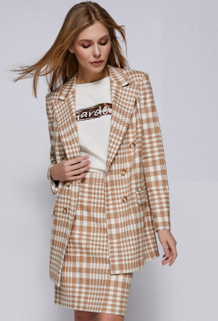 Удлинённый двубортный жакет прямого силуэта с застёжкой на петли, пуговицы бочком, выполнен из ткани гусиная лапка. Перед с горизонтальными карманами с рамками и клапанами. Спинка со средним швом. Рукава втачные двухшовные со шлицами и декоративными пуговицами. Воротник отложной с лацканами. Жакет на подкладке с плечевыми накладками.