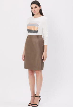 У юбки передняя половина с косыми карманами, в среднем шве задней половины юбки обработаны потайная молния и шлица. На подкладке .