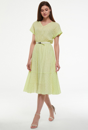 Платье свободного кроя с акцентированной талией, собранной на резинку, что делает силуэт более женственным. Низ юбки с отрезным воланом. Рукава цельнокроеные с отворотом. В среднем шве спинки платья обработан разрез с застежкой на декоративную пуговицу.