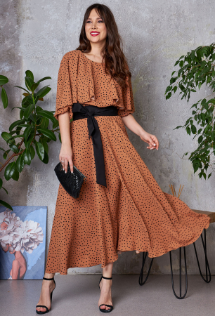 Женское платье из текстильной ткани. По полочке идет отлетная пелерина, платье отрезное по линии талии, на резинке. Рукав реглан 3/4, с фиксирующей резинкой по низу . По линии талии съемный пояс, благодаря которому можно регулировать посадку изделия. По спинке выполнен кокетливый вырез в виде капельки. Столь модное изделие в пол, не оставит без внимания ни одну из представительниц прекрасного пола. Платье превосходно будет смотреться на любом торжестве и не утратит своей актуальности. Длина юбки 100 см.