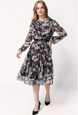 Двухслойное платье-миди, выполнено из шифона с цветочным принтом, отрезное в области талии и присборенное на резинку, с округлым вырезом горловины по спинке и фигурным вырезом с завязкой по переду, рукава втачные одношовные, сосборенные по низу на резинку и со сборкой по окату, линия талии дополнительно подчеркивается поясом-ремнем с пряжкой.