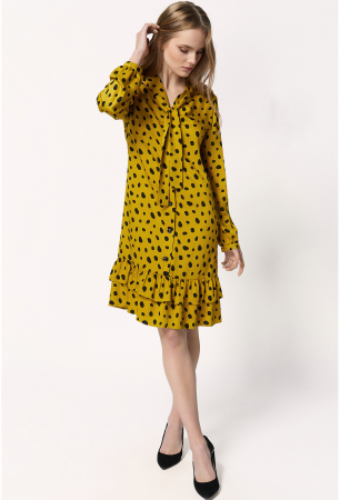 Платье женское свободного летящего силуэта. Воротник с завязкой-бант и V-образным вырезом горловины по центральной части переда, по низу платья притачной волан со сборкой.