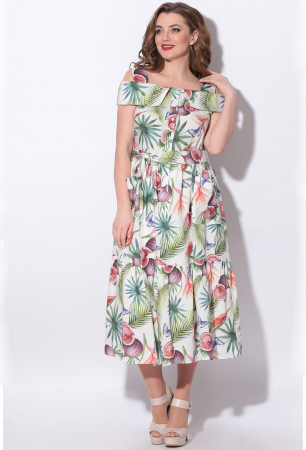 Платье свободного силуэта с подкладкой по юбке из штапеля.Отрезное по линии талии, юбка со сборкой и накладными карманами по переду. По лифу притачная планка застегивающаяся на петли и пуговицы. Воротник отложной с открытыми плечами на резинке, на бретелях. В комплект входит съемный пояс из основной ткани.