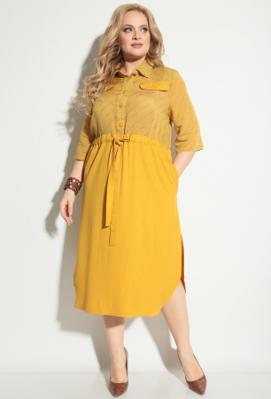 Нарядное и яркое платье рубашечного типа выполнено из вискозы. Натуральные ткани, модный цвет и свободное прилегание сделают его одним из любимых вещей в вашем гардеробе. В юбке скругленный низ переходящему в разрезы, пояс на стяжке которой регулируется плотность прилегания, талия чуть завышена, что визуально удлиняет ноги и прячет возможные нюансы в фигуре. 3/4 рукав с манжетой, которую можно отложить укоротив тем самым длину. На груди клапаны имитирующие карман. Длина по спинке 118 см (±1 см), дина по спинке до пояса-резинки 48 см (±1 см), длина рукава от плечевого шва 46 см. Модель подойдет на рост 170 см.