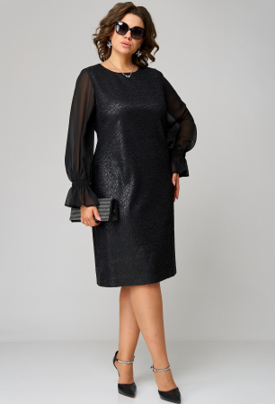 Платье женское нарядно полуприлегающего силуэта слегка расширенное к низу выполнено из плательной ткани с набивным дизайном с блестящей нитью в сочетании с сеткой. Вырез горловины круглый обработан обтачкой, рукав втачной по низу с воланам. Спинка с центральным швом и потайной застежкой -молнией. По низу спинки обработан небольшой разрез. Декором платья служит дизайн основной ткани.