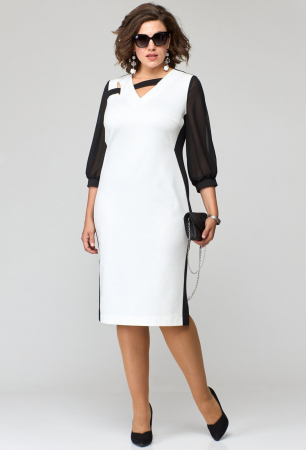 Платье женское нарядно-повседневное прилегающего силуэта зауженное книзу, выполнено из трикотажного полотна двух дизайнов в сочетании с шифоном. Вырез горловины V-образный обработан обтачкой. Рукав втачной 3/4, по низу со сборкой на притачной манжете. По спинке центральный шов и потайная застежка-молния. В боковых швах обработаны разрезы. декором служит отделочный элемент по полочке платья.
