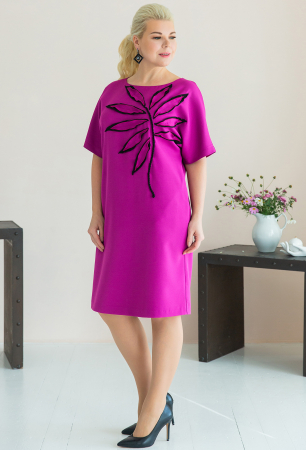 Платье прямого силуэта с цельнокроеным коротким рукавом и расширенной горловиной. По переду декоративная аппликация.