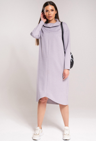 Платье женское свободного силуэта выполнено из трикотажного полотна. Рукав втачной. Воротник стойка цельнокроеная. Платье с карманами в швах и фигурным низом по переду.
