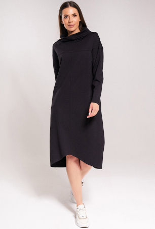 Платье женское свободного силуэта выполнено из трикотажного полотна. Рукав втачной. Воротник стойка цельнокроеная. Платье с карманами в швах и фигурным низом по переду.