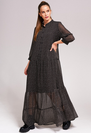 Платье свободного кроя из шифона длина макси. Верхняя часть переда с планкой которая застегивается на пуговицы. Платье с двумя воланами на сборке. Воротник стойка. Рукав втачной со сборкой по низу с притачной манжетой. Платье на подкладке.