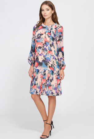 Изящное запоминающееся платье прямого силуэта выполнено из мягкого, приятного шифона с нежным цветочным мотивом и 100 % вискозной подкладки. Отложной воротник- стойка, на округлом вырезе горловины с красиво оформленным бантом спереди, добавляет модели элегантности, а обилие складок на оборке по низу -задают нежное, кокетливое настроение. Лёгкость модели придают полупрозрачные рукава сосборенные по низу на эластичную тесьму с небольшой сборкой по акату. В среднем шве спинки обработана застежка на навесные петли и пуговицы.