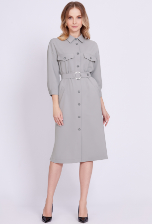 Платья-рубашка свободного кроя. Украшенное нагрудными карманами с фигурными клапанами с пуговицами и функциональными косыми карманами, делает это платье особенно комфортным. Лёгкость модели придают укороченные рукава с притачными манжетами и разрезы в боковых швах. Ярким акцентом платья является интересный пояс из основной ткани.