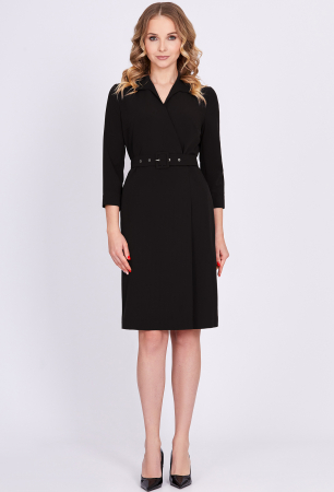 Оригинальное платье полуприлегающего силуэта, с интересными решениями кроя – отлично подойдет для делового образа. По переду платье отрезное по талии, верхняя часть платья с имитацией запаха и V-образным вырезом горловины, который способен зрительно поиграть с длиной шеи, нижняя часть со складкой, которая придаёт больше динамичности при движении. В среднем шве спинки обработана шлица. Взгляд к платью также приковывают воротник-апаш фигурной формы и укороченные втачные рукава с манжетами и отделочными пуговицами. Линию талии красиво подчёркивает пояс-ремень из основной ткани.