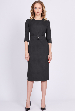 Платье-миди приталенного силуэта с овальным вырезом горловины. Перед с полурельефами и вытачками, спинка со средним швом и вытачками . В среднем шве спинки обработаны потайная молния и шлица. Рукава втачные. Платье дополняются поясом с пряжкой из основной ткани и брошью.