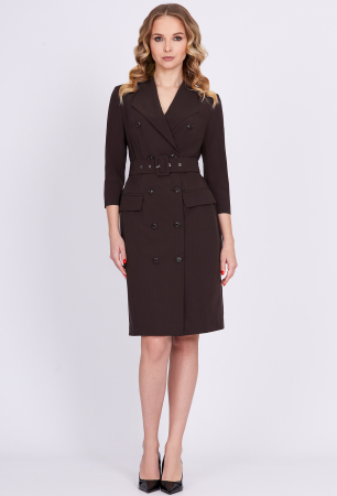 Платье полуприлегающего силуэта с втачными укороченными рукавами. Модель стильно смотрится за счёт эффектного воротника «Апаш» с широкими лацканами, двубортной застёжке с пуговицами, а также поясом с пряжкой. По переду платья обработаны функциональные карманы с клапанами и рамками.