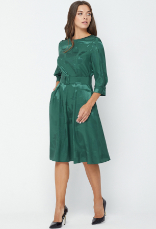Элегантное платье Х-образного силуэта выполнено из красивой ткани. Романтичность платью придают интересного кроя укороченные рукава со складками и притачными манжетами с декоративными пуговицами. В среднем шве спинки обработана потайная молния, а в боковых швах функциональные карманы. Чтобы сделать модель еще более эффектной, линию талии подчеркнули широким поясом с пряжкой из основной ткани.