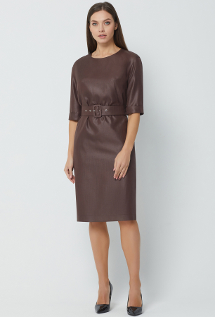 Платье прямого силуэта с округлым вырезом горловины, слегка спущенной линией плеча, выполнено из костюмно-плательной ткани. Перед с косыми вытачками, в которых обработаны карманы. В среднем шве спинки обработаны потайная молния и шлица. Рукава одношовные с отложными манжетами. Дополняется поясом с пряжкой из основной ткани.