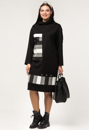 Платье прямого силуэта из трикотажного полотна.Модные линии кроя ,графичные четкие линии и текстовая печать по спинке -те самые козыри гардероба современной стильной женщины. Горловина платья оформлена мягко драпирующимся воротником -хомут