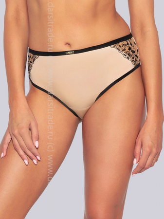 Трусики слип из коллекции АVA 2061 выполнены в телесном цвете спереди из эластичного трикотажного полотна со вставками из сетки с вышивкой черной нитью. Спинка из эластичного трикотажного полотна, проймы ног из сетки, сложенной вдвое. Резинки контрастного черного цвета. Ластовица проложена 100% хлопком.