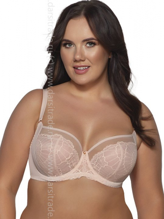 Бюстгальтер выполнен с шитыми мягкими чашками на косточках. Бретельки регулируются по длине, не отстёгиваются. На спине застёжка на удлинитель, количество крючков в ряду застёжки увеличивается пропорционально размеру бюстгальтера. Фурнитура металлическая цвета меди.