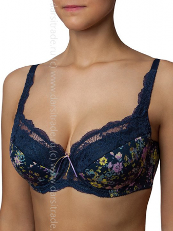 Бюстгальтер на поролоне. Выполнен эластичного кружева и принтованного полотна. Нижние детали чашки на дубляже с хлопком. Идеально приподнимает и поддерживает грудь, создавая красивую зону декольте. На стане бюстгальтера боковые корректирующие пластины, позволяющие прилегать к телу и не скручиваться поясу бюстгальтера, создают необходимую опору и делают силуэт более четким. Украшение: атласный двухцветный бантик.
