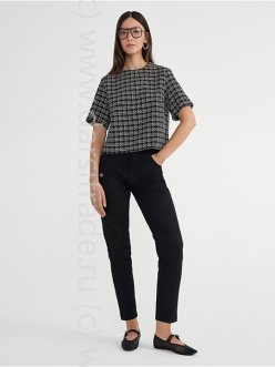 Черные джинсы умеренно свободного силуэта mom с высокой посадкой, подчеркивающей талию. Застежка на пуговицу и молнию, скрытую планкой, 4 функциональных кармана. Мягкий eco-friendly деним