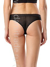 Трусы «танга» с низкой линией талии созданы в стиле «ретро-шик» из эластичного полупрозрачного полотна с рисунком «гусиная лапка». Нижние срезы задней детали обработаны плоским швом, верхние - широкой плоской тесьмой, благодаря которой модель незаметна под одеждой.