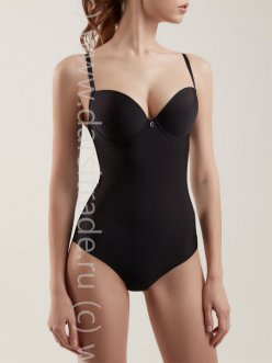 Боди с формованной чашкой, на каркасах. Выполнена из тонкого шелковистого полотна с блеском. Плотная формованная чашка. Невидима под одеждой благодаря гладкой чашке. Спинка с трусами танга из полотна всгиб. Дополнительная застежка на спинке.