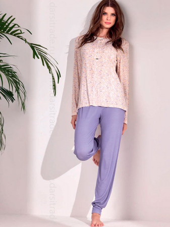 Пижама: кофта с длинным рукавом и брюки на манжетах. Выполнена из принтованной вискозы. Коллекция "Coriander".