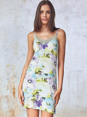 Сорочка на узких бретелях. Выполнена из принтованной вискозы, декорирована кружевом по линии декольте. Коллекция "Summer".