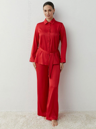 Женская однотонная пижама: удлиненная рубашка на поясе с длинным рукавом с манжетами, отложным воротником, застежкой – планкой и фигурным низом и прямые брюки с поясом на резинке. Изготовлена из гладкого и легкого искусственного шелка, который приятно ощущается на теле и хорошо сохраняет форму. Деликатная обработка края обеспечивает дополнительный комфорт. Комфортный повседневный костюм для дома и сна, который идеально сочетает в себе лаконичный дизайн и удобный крой.