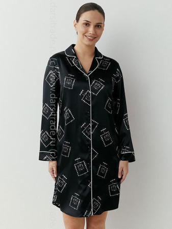 Женская пижамная рубашка на пуговицах с контрастным принтом и длинным рукавом, длиной до колена. Рубашка прямого силуэта с нагрудными вытачками. Изготовлена из гладкого и легкого искусственного шелка, который приятно ощущается на теле и хорошо сохраняет форму. Изящная и комфортная рубашка с элегантным и минималистичным принтом отлично подойдет для дома и сна. Стильное решение на каждый день.